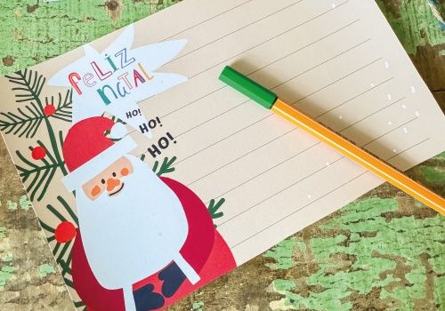A criança pode escrever (ou desenhar) seus desejos, agradecer pelo ano e decorar a cartinha com as cores do Natal.